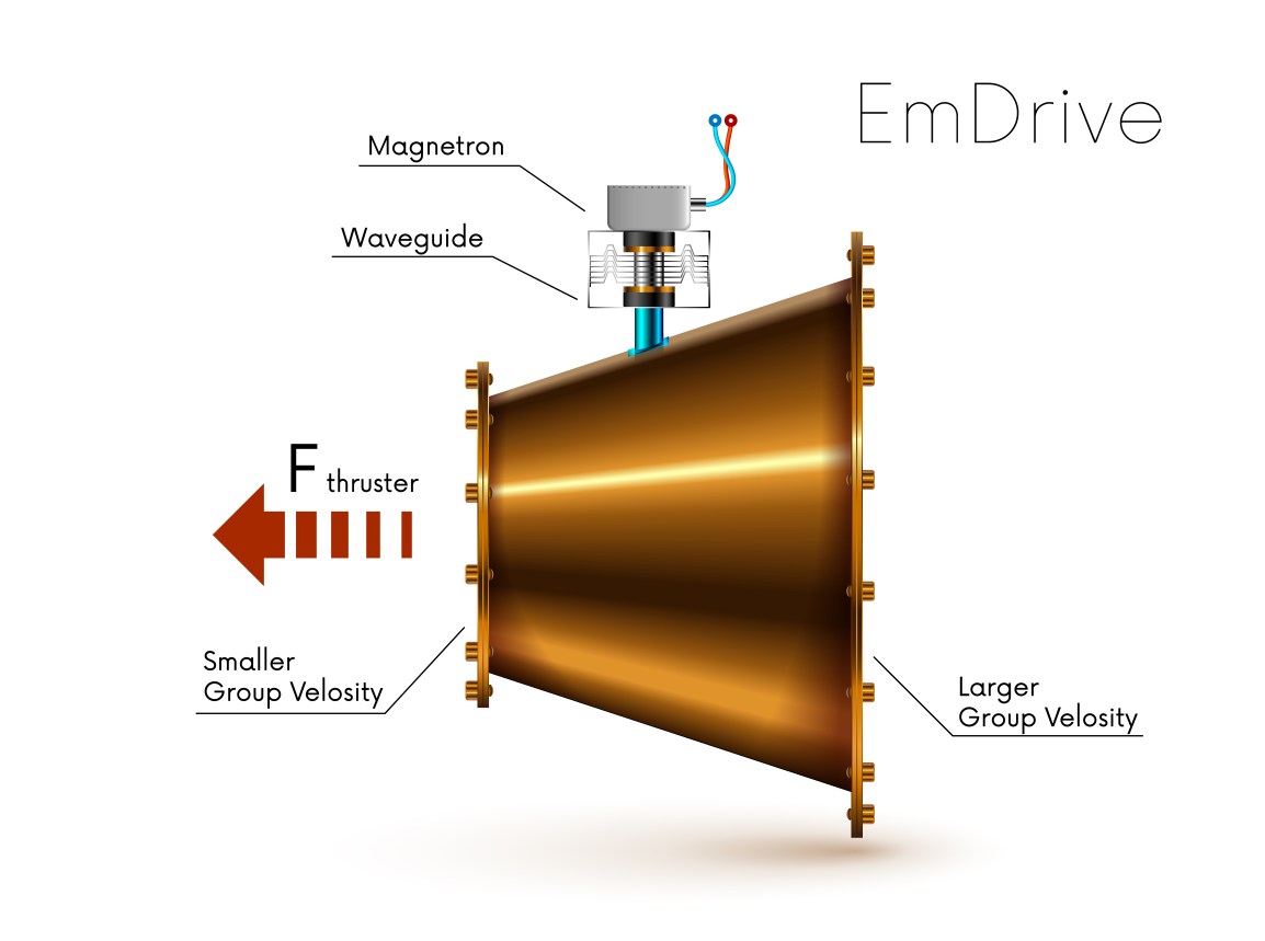 An Electromagnetic (EM) Drive, is also known as a Radio Frequency Resonant Cavity Thruster. It creates a force by bouncing microwaves back and forth in a truncated cone. The energy is thrust towards the narrow end of the cone which prompts the device to begin moving. As the cone moves, the momentum increases and it advances without the need for a propellant. This works against Newton’s Third Law of Motion, which states that ‘for every action there is an equal and opposite reaction.’ Based on this theory the concept of creating an EM Drive should be impossible, yet many scientists believe that one can be made. China has even claimed to have gone against the current Laws of Physics, and created a functioning prototype.